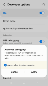 - When the device is connected to the computer, you should be prompted to Allow USB debugging.