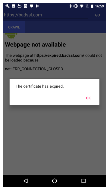 The Secured Network Communication Debugging App will inspect the connection for anything that looks suspicious. Once the app detects an unprotected connection (for example, expired certificate, not allowed cipher suite, etc) it will alert the problem with a pop-up custom notification.