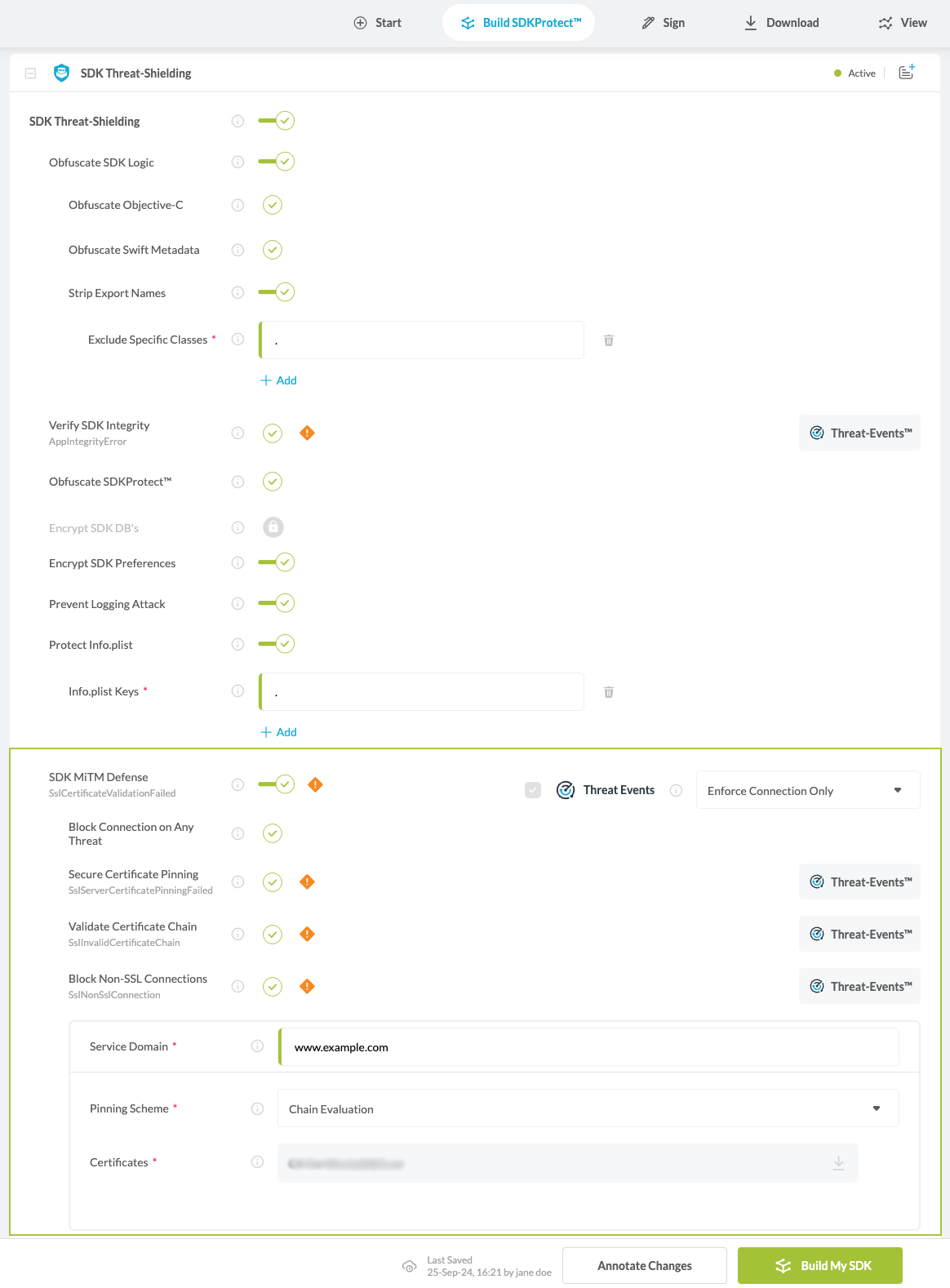 - Where: Inside the Appdome Console, go to Build SDKProtect™ > SDK Threat-Shielding section.