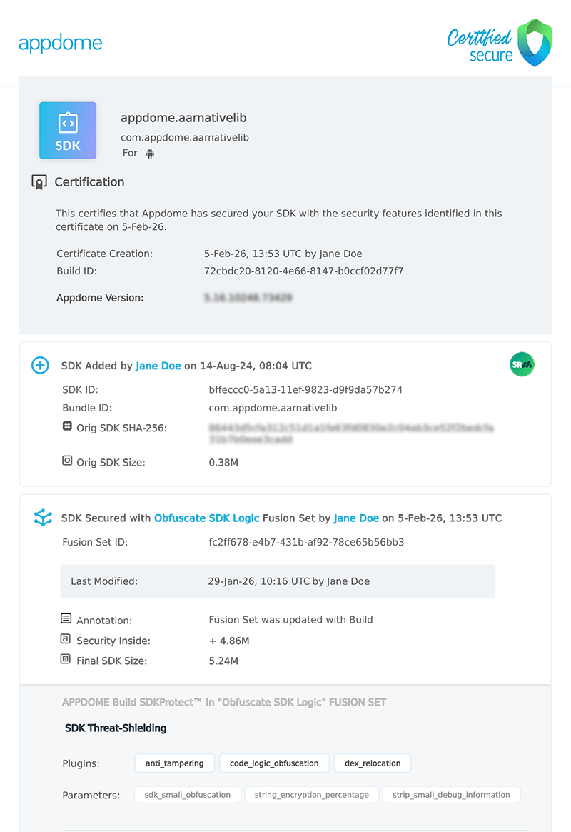 This certificate verifies that Appdome has secured your SDK (com.android.sdk.id) with specific security features, as identified in the certification details. Issued to your secured SDK, this certificate details the implementation of Appdome’s SDK Threat Shielding and SDK Threat Intelligence features that you have chosen to build into your SDK.
