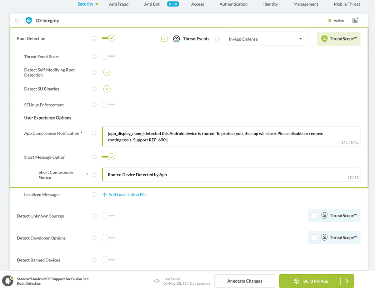 Navigate to Build > Security tab > OS Integrity section in the Appdome Console.
