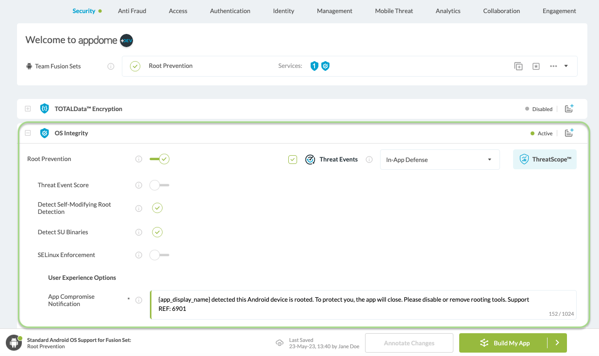 Follow the steps in Sections 2.2-2.2.2 of this article to add the Root Detection feature to your Fusion Set via the Appdome Console.