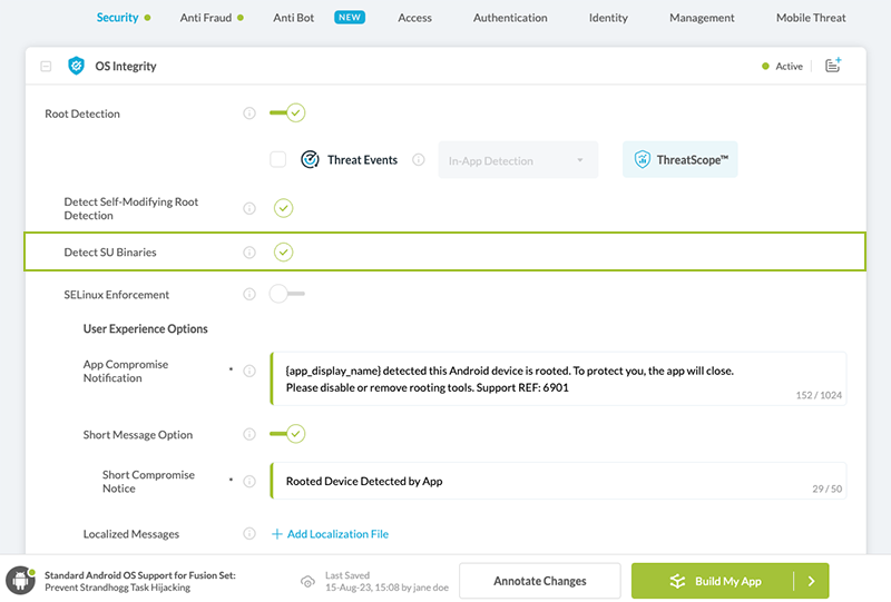 With Threat-Events™ enabled (turned ON), Android developers can get detailed attack intelligence and granular defense control in Android applications and create amazing user experiences for all mobile end users when SU Binaries is detected.