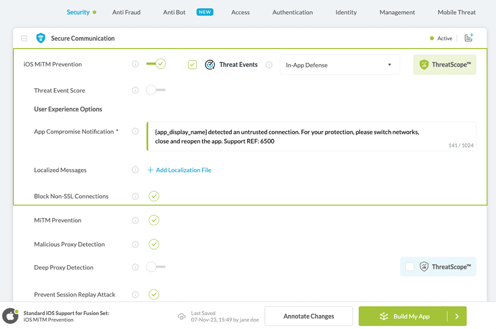 Each Certified Secure™ certificate provides DevOps and DevSecOps organizations the entire workflow summary, audit trail of each build, and proof of protection that iOS MitM Prevention has been added to each iOS app. Certified Secure provides instant and in-line DevSecOps compliance certification that iOS MitM Prevention and other mobile app security features are in each build of the mobile app.