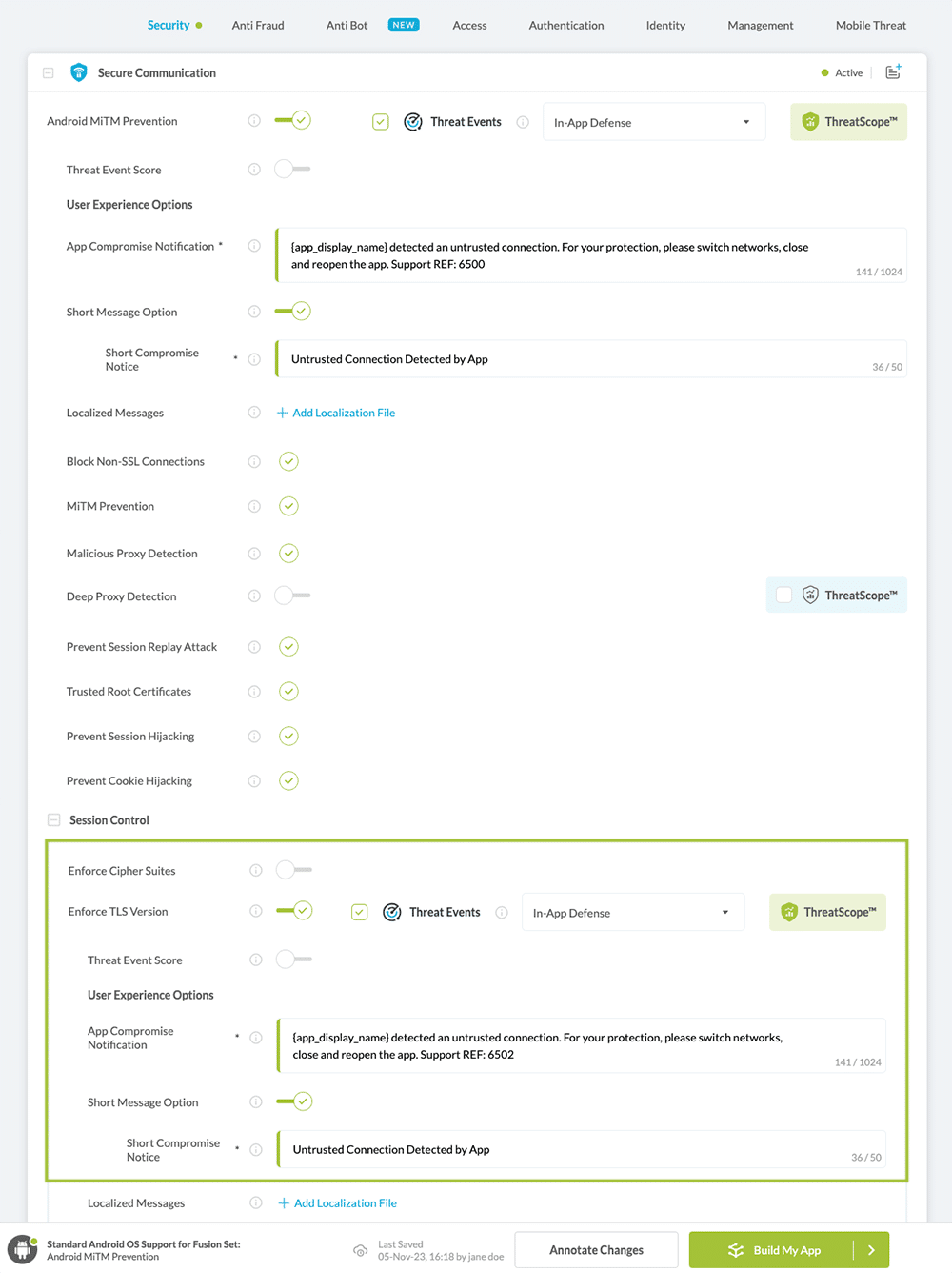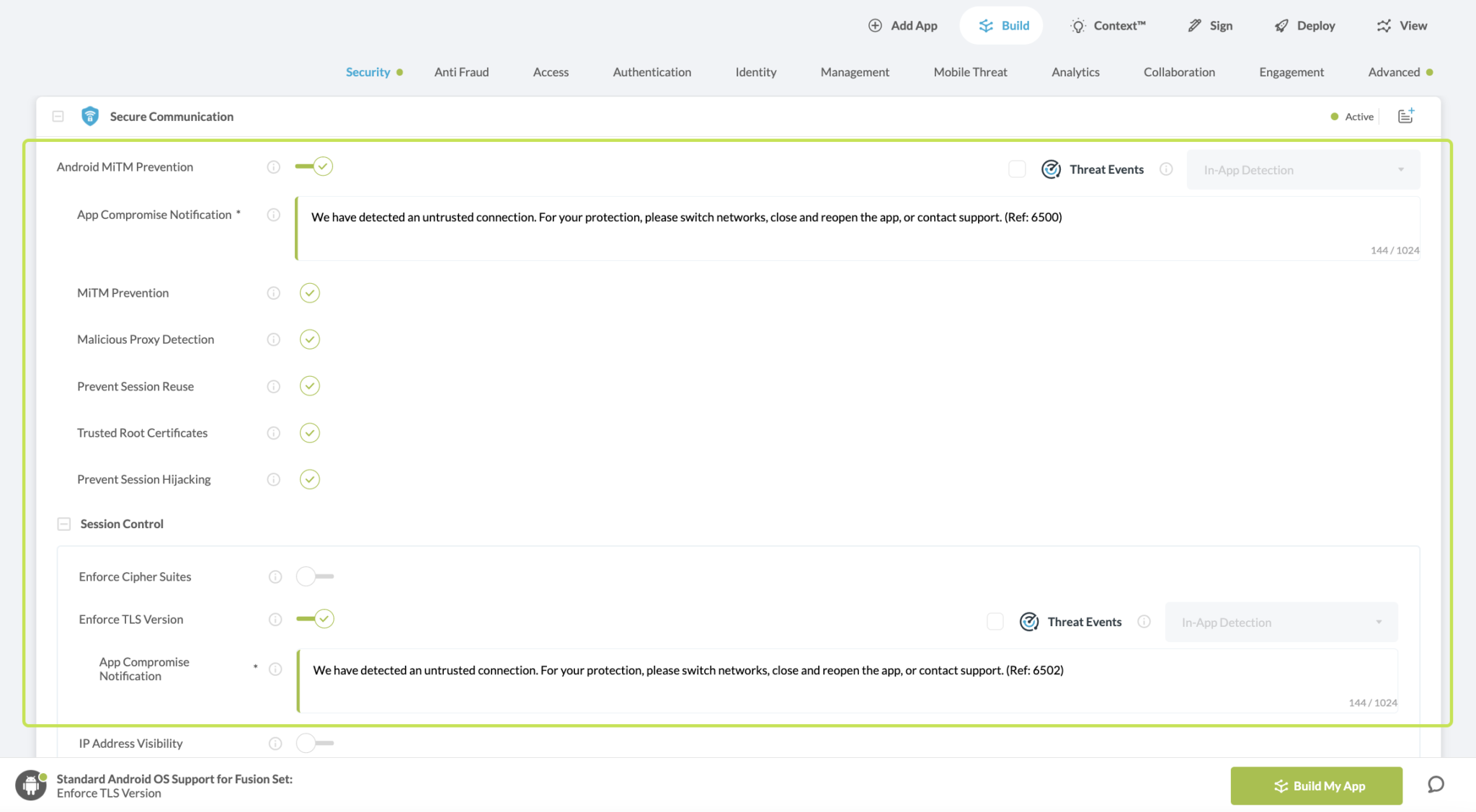 With Threat-Events™ enabled (turned ON), Mobile developers can get detailed attack intelligence and granular defense control in Mobile applications and create amazing user experiences for all mobile end users when Secure TLS Version is detected.
