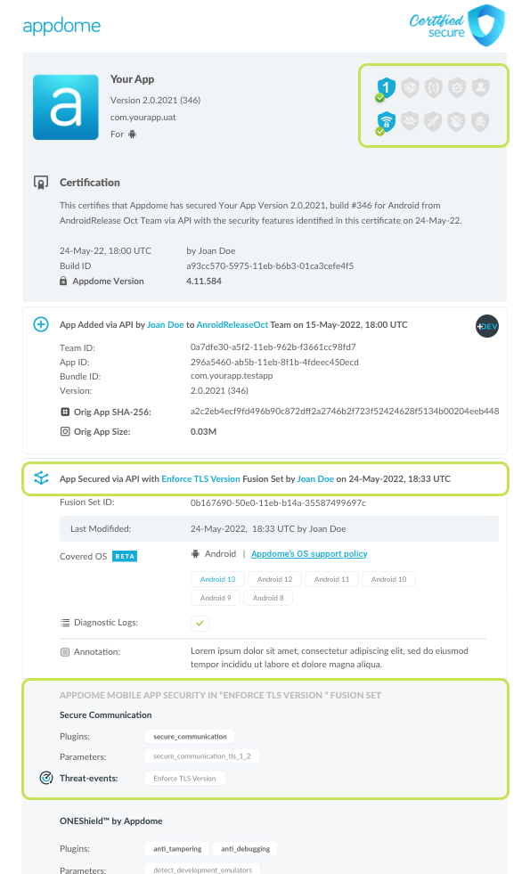 Each Certified Secure™ certificate provides DevOps and DevSecOps organizations the entire workflow summary, audit trail of each build, and proof of protection that Secure TLS Version has been added to each Mobile app. Certified Secure provides instant and in-line DevSecOps compliance certification that Secure TLS Version and other mobile app security features are in each build of the mobile app.
