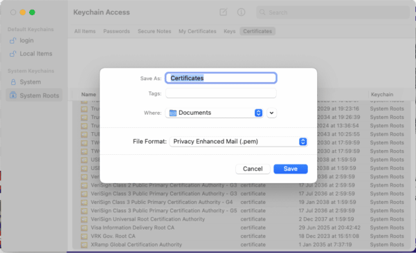 - Save the certificates in an easily accessible folder, for example Certificates.pem in the Documents folder as suggested by default.