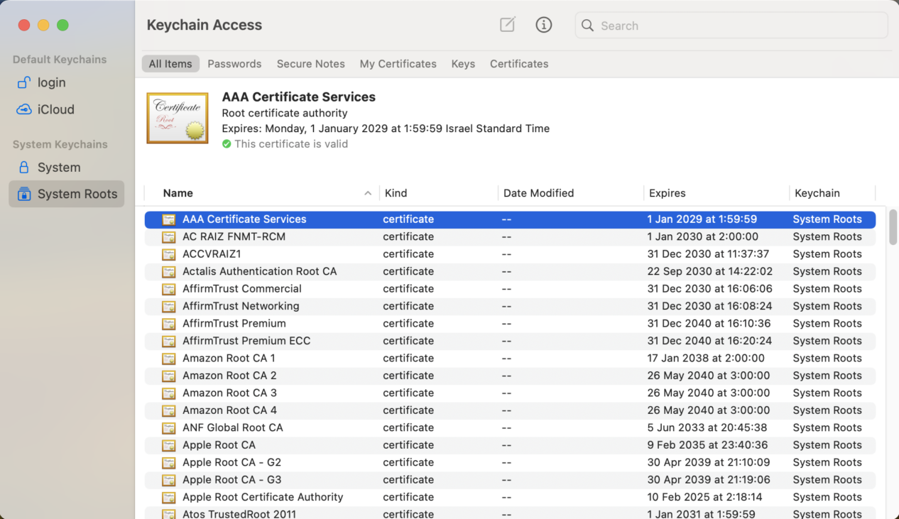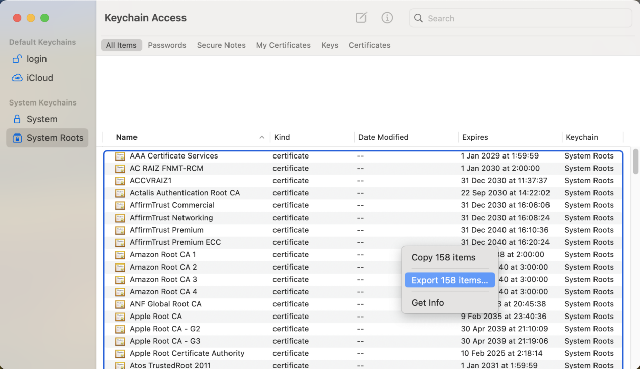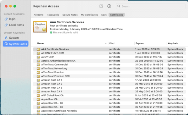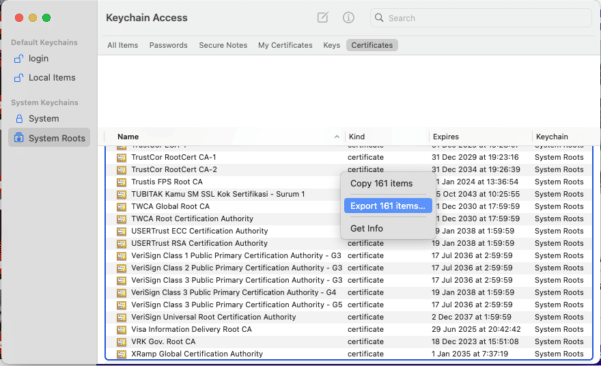 - To select all the certificates at once, click on the top entry, scroll down to the bottom of the list, and click on the bottom entry while holding the “Shift” button on your keyboard.