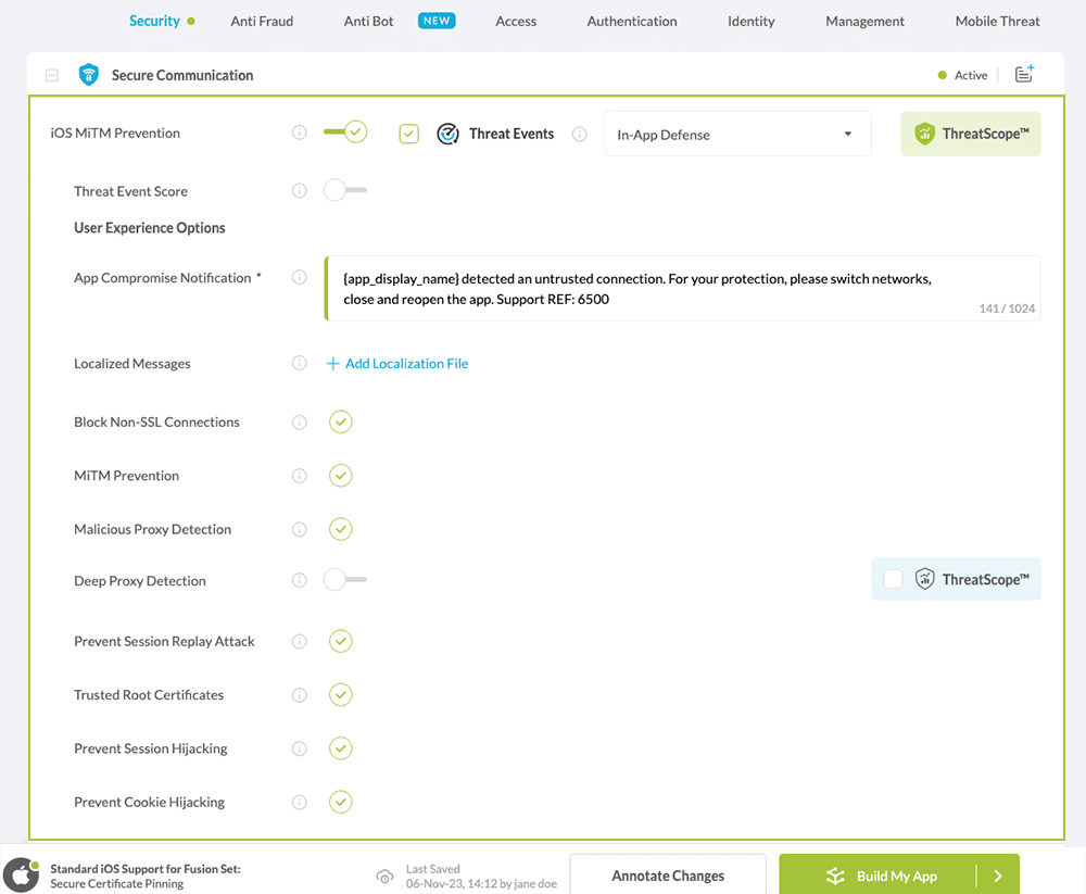 With Threat-Events™ enabled (turned ON), Mobile developers can get detailed attack intelligence and granular defense control in Mobile applications and create amazing user experiences for all mobile end users when Cookie Hijacking is detected.