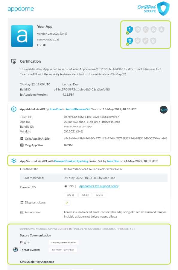 Each Certified Secure™ certificate provides DevOps and DevSecOps organizations the entire workflow summary, audit trail of each build, and proof of protection that Prevent Cookie Hijacking has been added to each Mobile app. Certified Secure provides instant and in-line DevSecOps compliance certification that Prevent Cookie Hijacking and other mobile app security features are in each build of the mobile app.