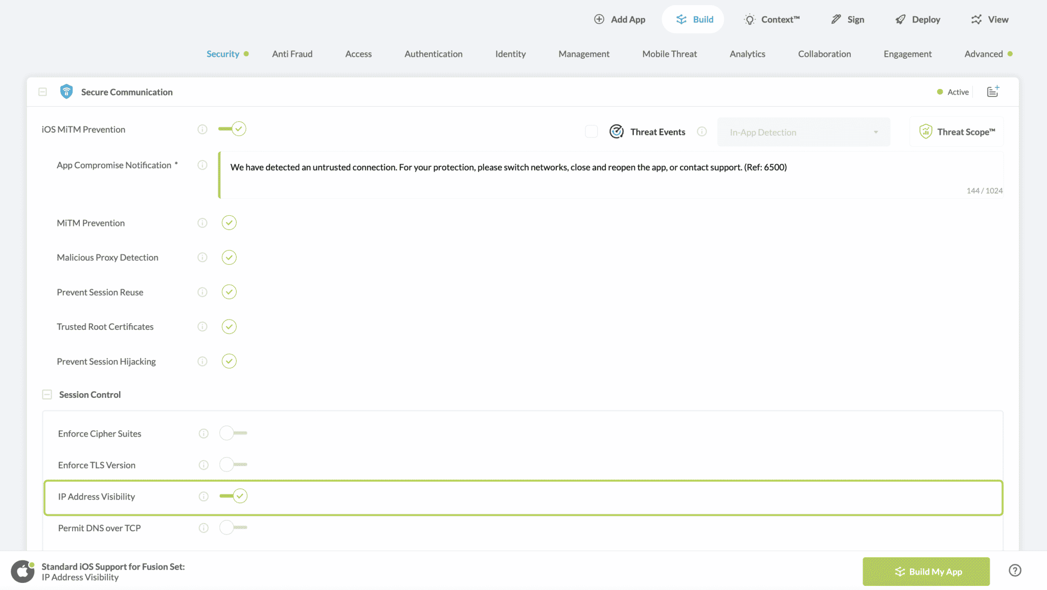 Using Appdome, there are no development or coding prerequisites to build secured Mobile Apps by using IP Address Visibility. There is no SDK and no library to code or implement in the app and no gateway to deploy in your network. All protections are built into each app and the resulting app is self-defending and self-protecting.
