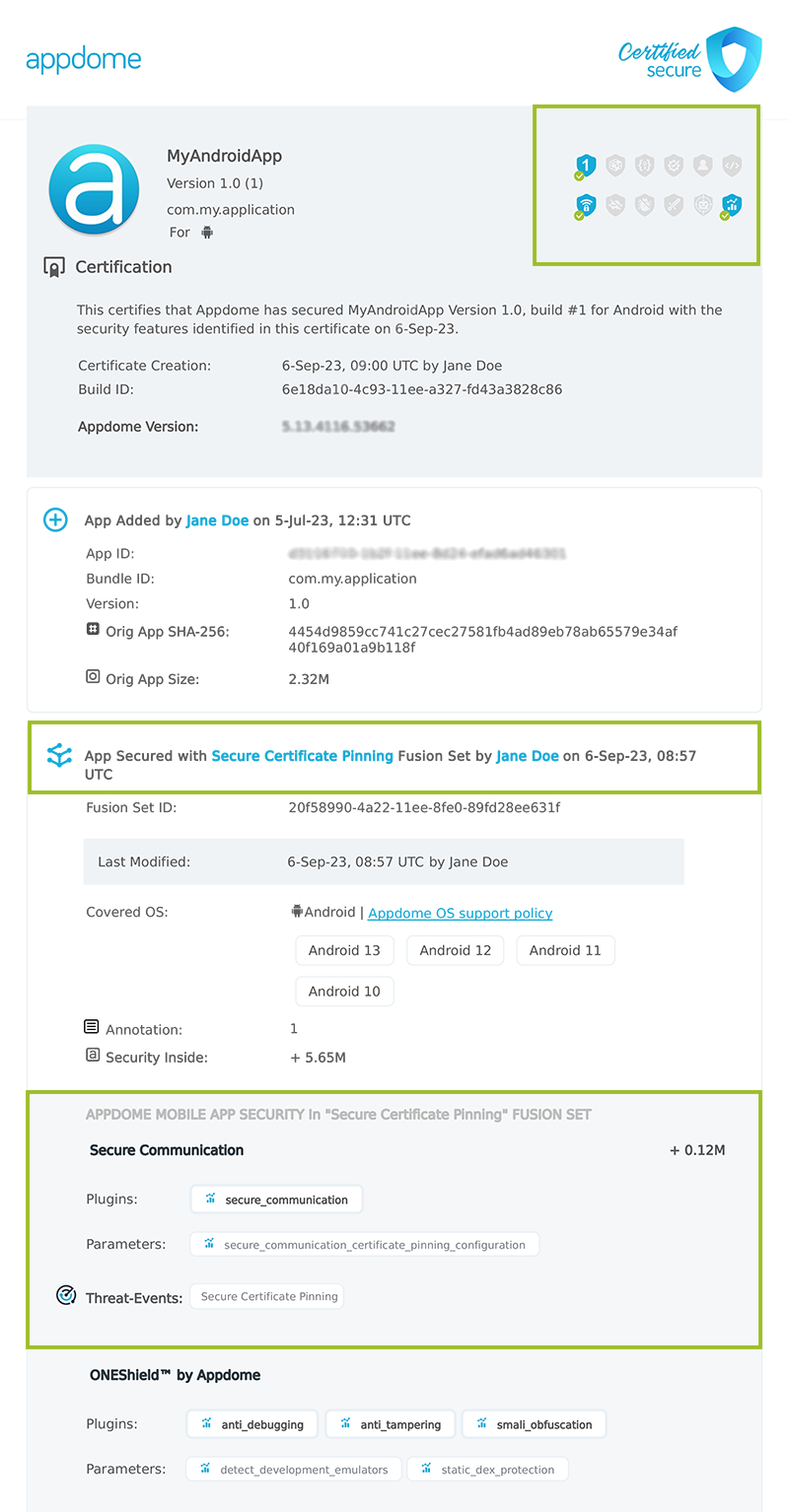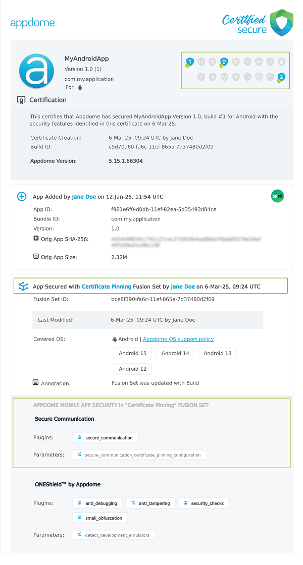 Each Certified Secure™ certificate provides DevOps and DevSecOps organizations the entire workflow summary, audit trail of each build, and proof of protection that Certificate Pinning has been added to each Mobile app. Certified Secure provides instant and in-line DevSecOps compliance certification that Certificate Pinning and other mobile app security features are in each build of the mobile app.