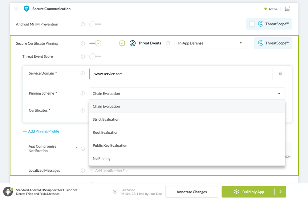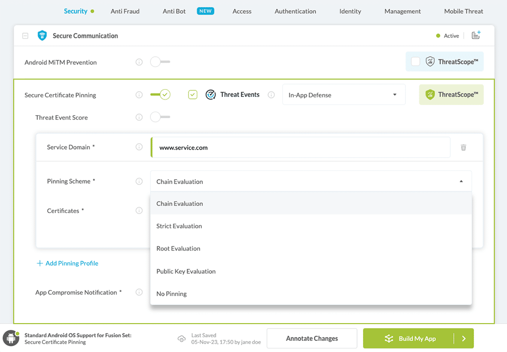 With Threat-Events™ enabled (turned ON), Mobile developers can get detailed attack intelligence and granular defense control in Mobile applications and create amazing user experiences for all mobile end users when Certificate Pinning is detected.