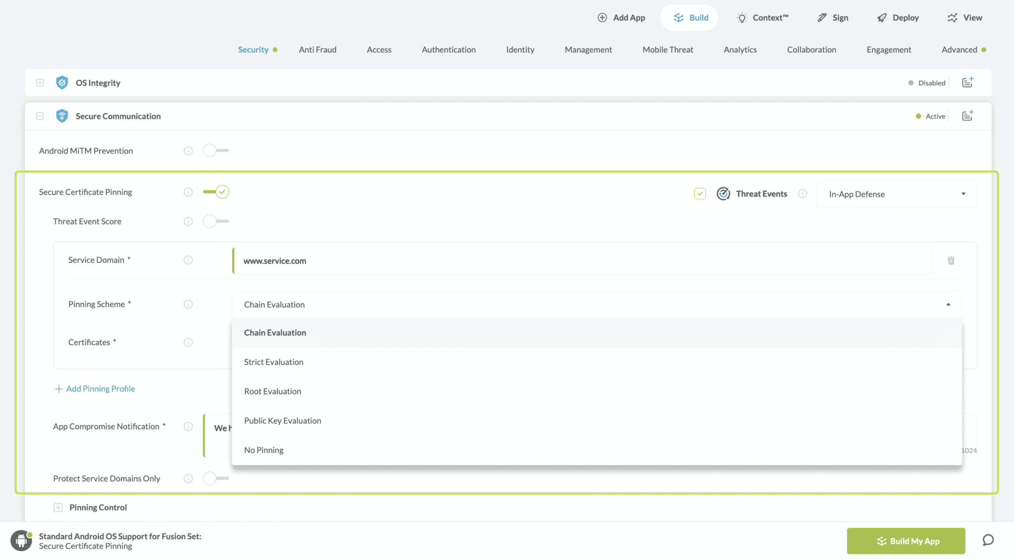 Navigate to Build > Security tab > Secure Communication section in the Appdome Console.