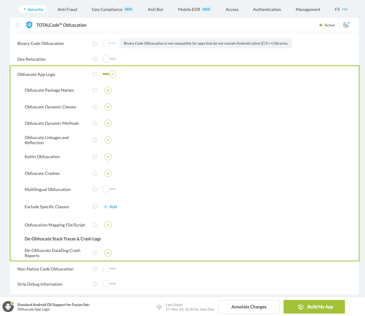 Figure 2: Fusion Set that displays the newly added Obfuscate App Logic protection.