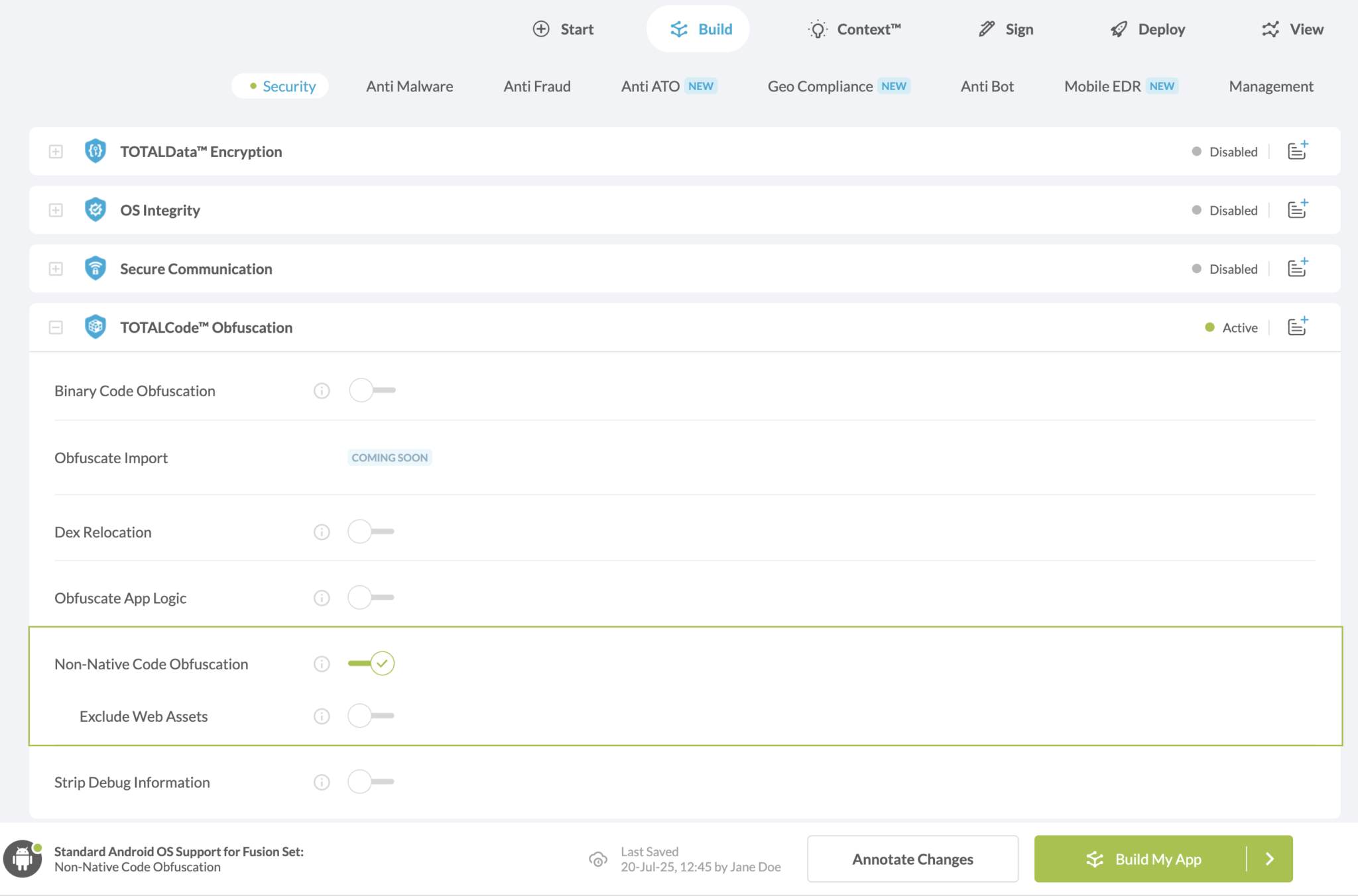 Navigate to Build > Security tab > TOTALCode™ Obfuscation section in the Appdome Console.