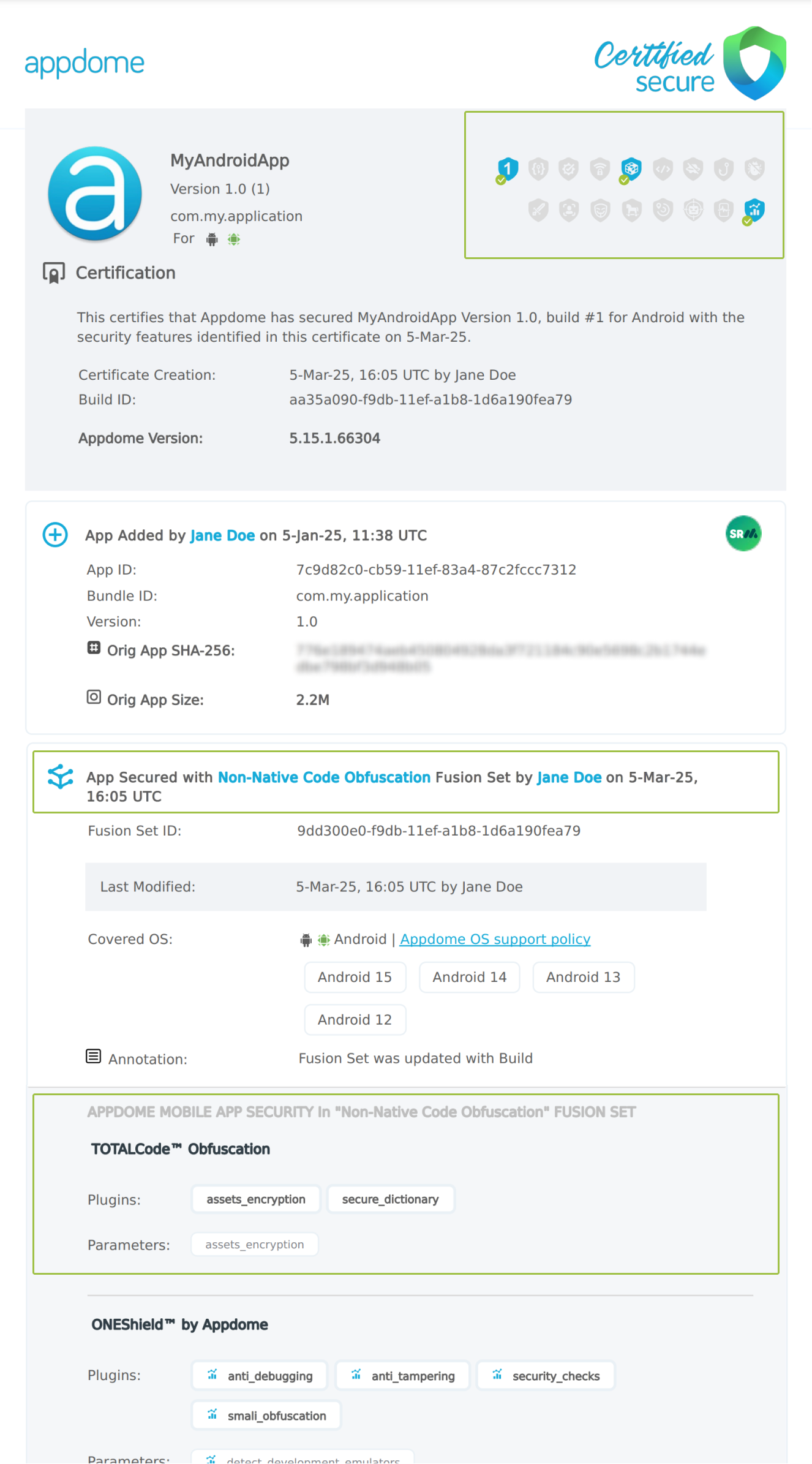 Each Certified Secure™ certificate provides DevOps and DevSecOps organizations the entire workflow summary, audit trail of each build, and proof of protection that Non-Native Code Obfuscation has been added to each Mobile app. Certified Secure provides instant and in-line DevSecOps compliance certification that Non-Native Code Obfuscation and other mobile app security features are in each build of the mobile app.
