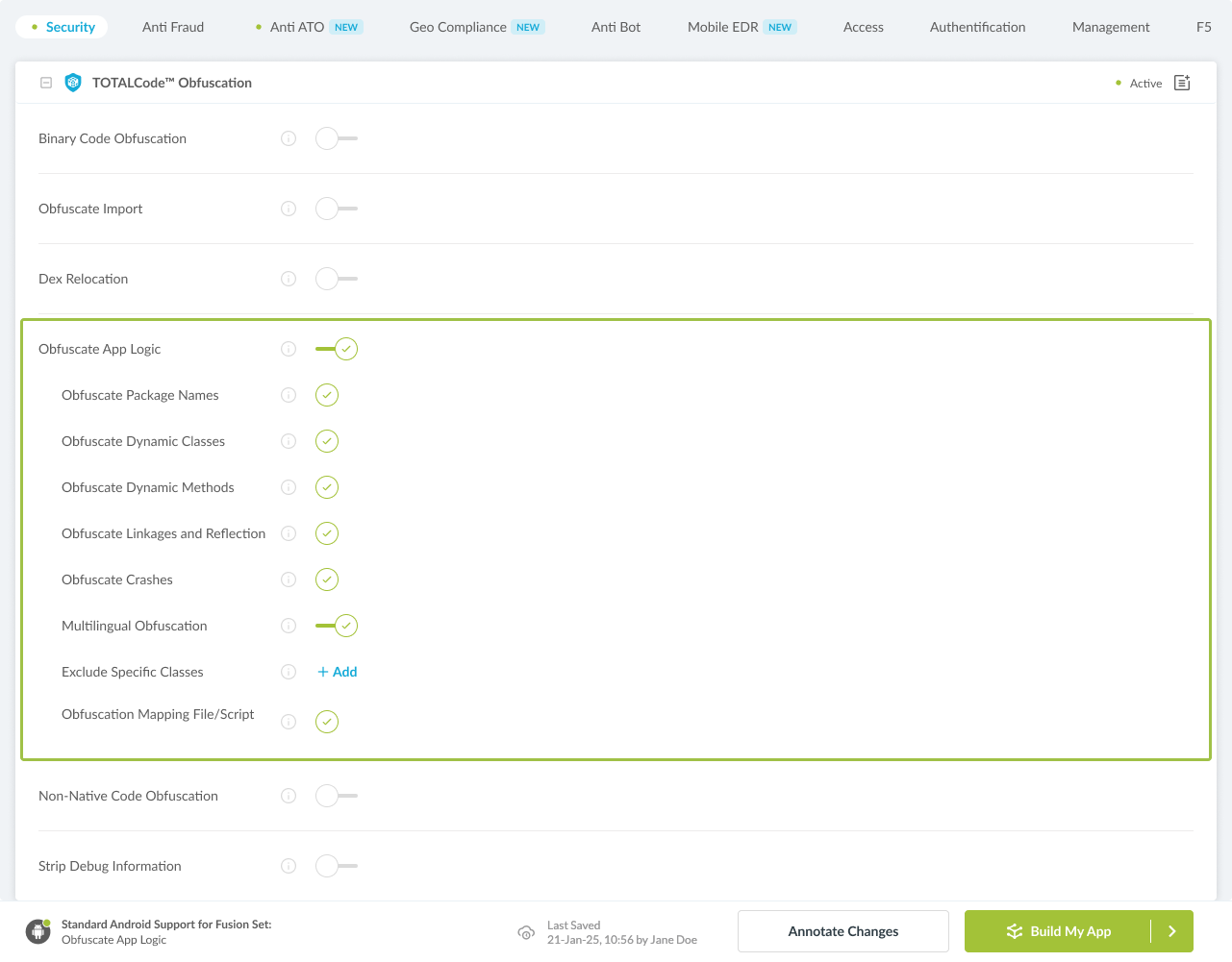 2. Follow the steps in Sections 2.2-2.2.2 of this article to add the Obfuscate App Logic feature to your Fusion Set via the Appdome Console.