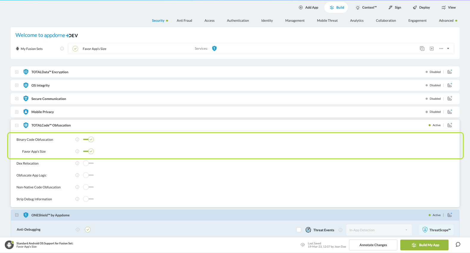 Navigate to Build > Security tab > TOTALCode™ Obfuscation section in the Appdome Console.