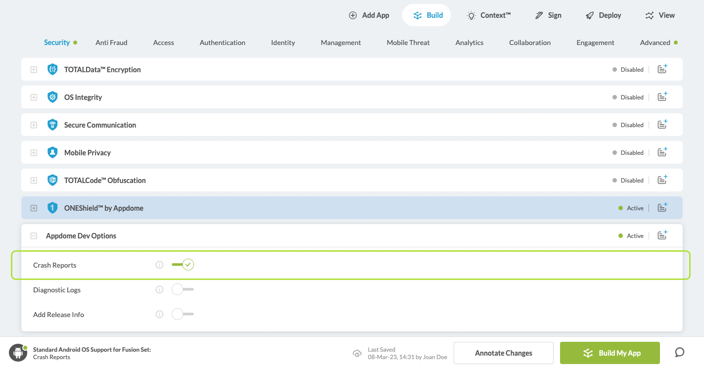 Navigate to Build > Security tab > ONEShield™ section in the Appdome Console.