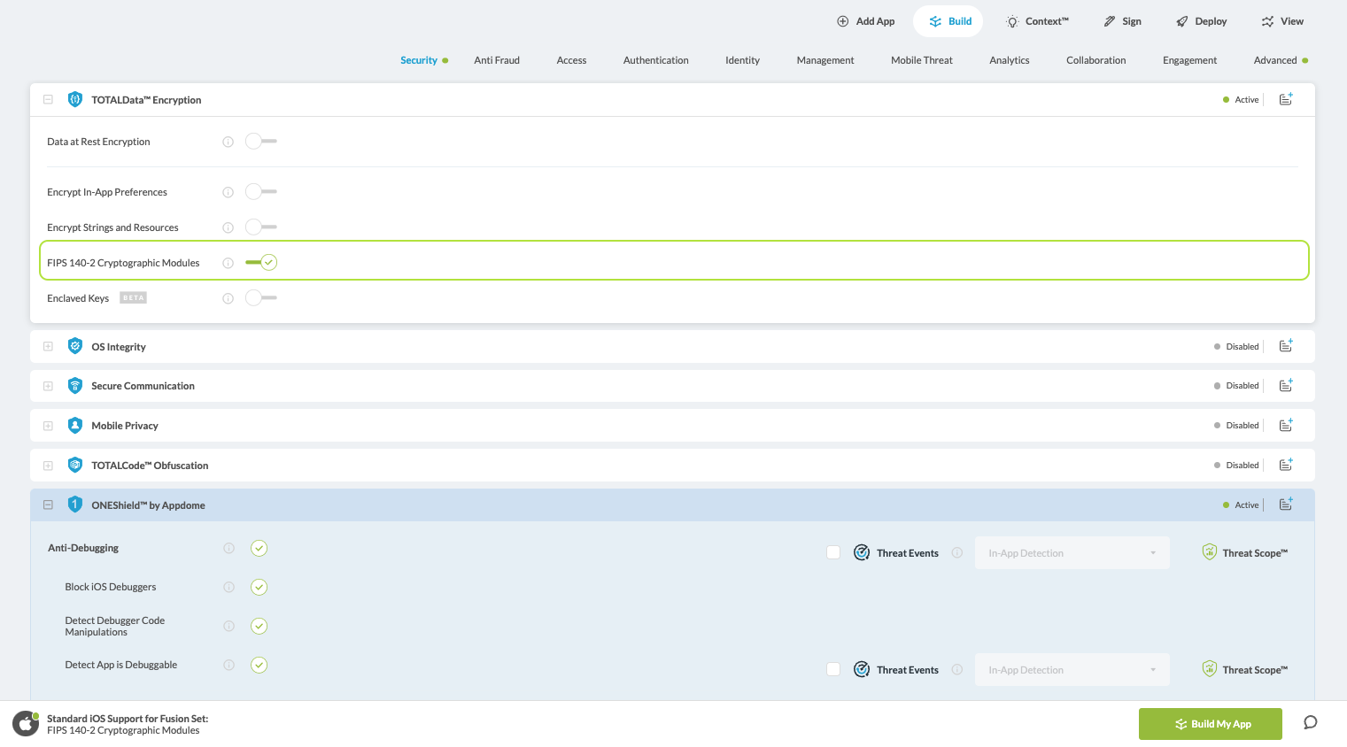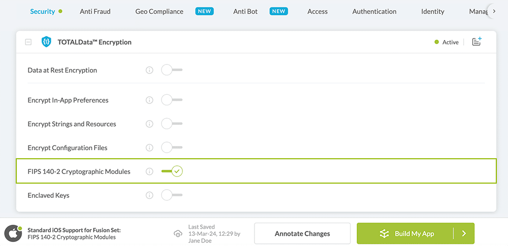 Navigate to Build > Security tab > TOTALData™ Encryption section in the Appdome Console.