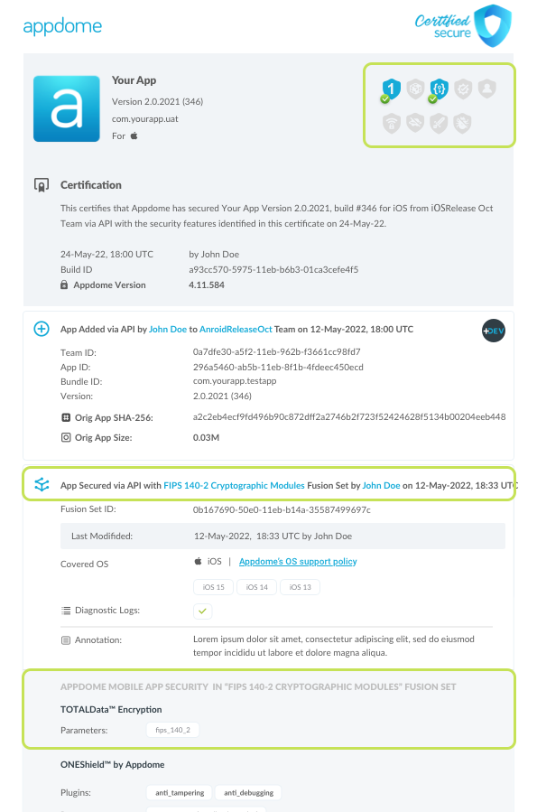 Each Certified Secure™ certificate provides DevOps and DevSecOps organizations the entire workflow summary, audit trail of each build, and proof of protection that FIPS 140-2 Cryptographic Modules has been added to each Mobile app. Certified Secure provides instant and in-line DevSecOps compliance certification that FIPS 140-2 Cryptographic Modules and other mobile app security features are in each build of the mobile app.