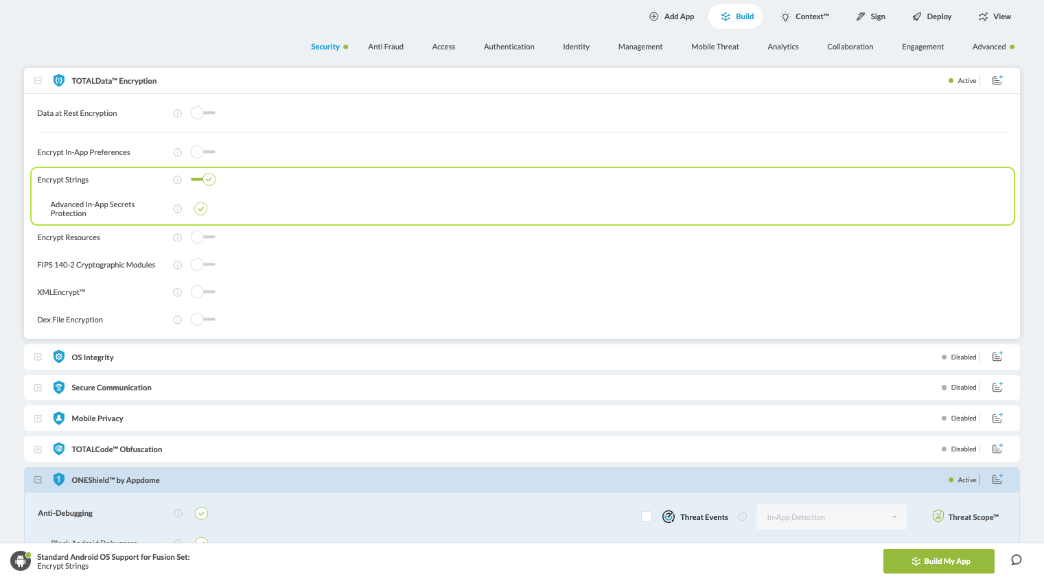 1. Navigate to Build > Security tab > TOTALData™ Encryption section in the Appdome Console.