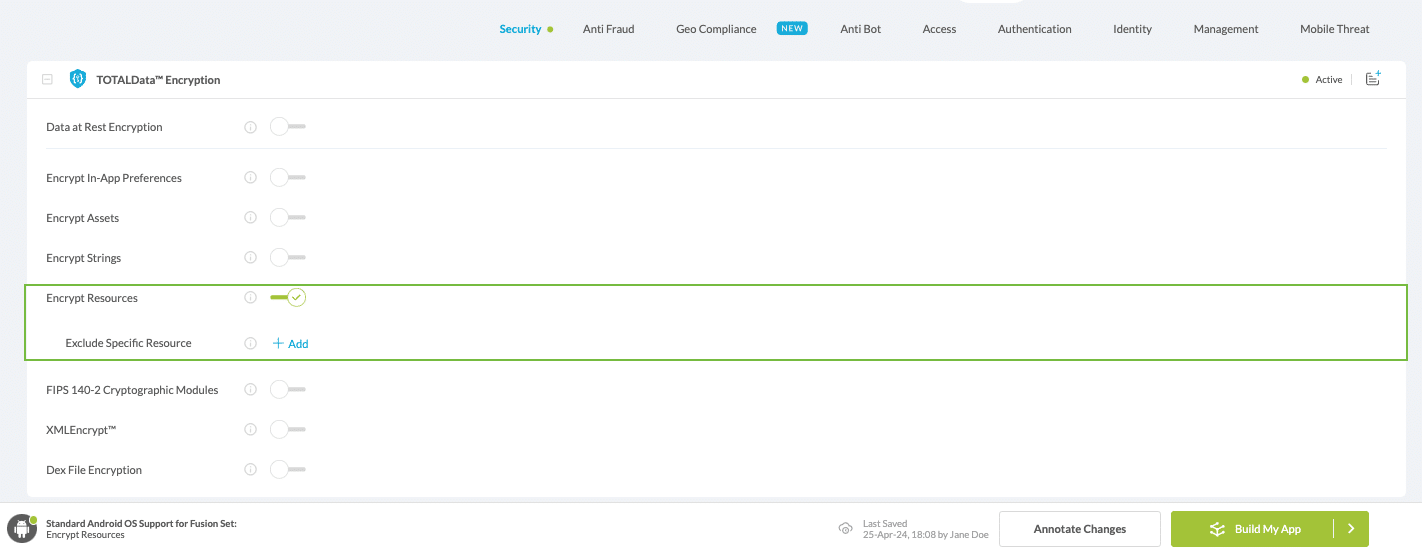 Navigate to Build > Security tab > TOTALData™ Encryption section in the Appdome Console.
