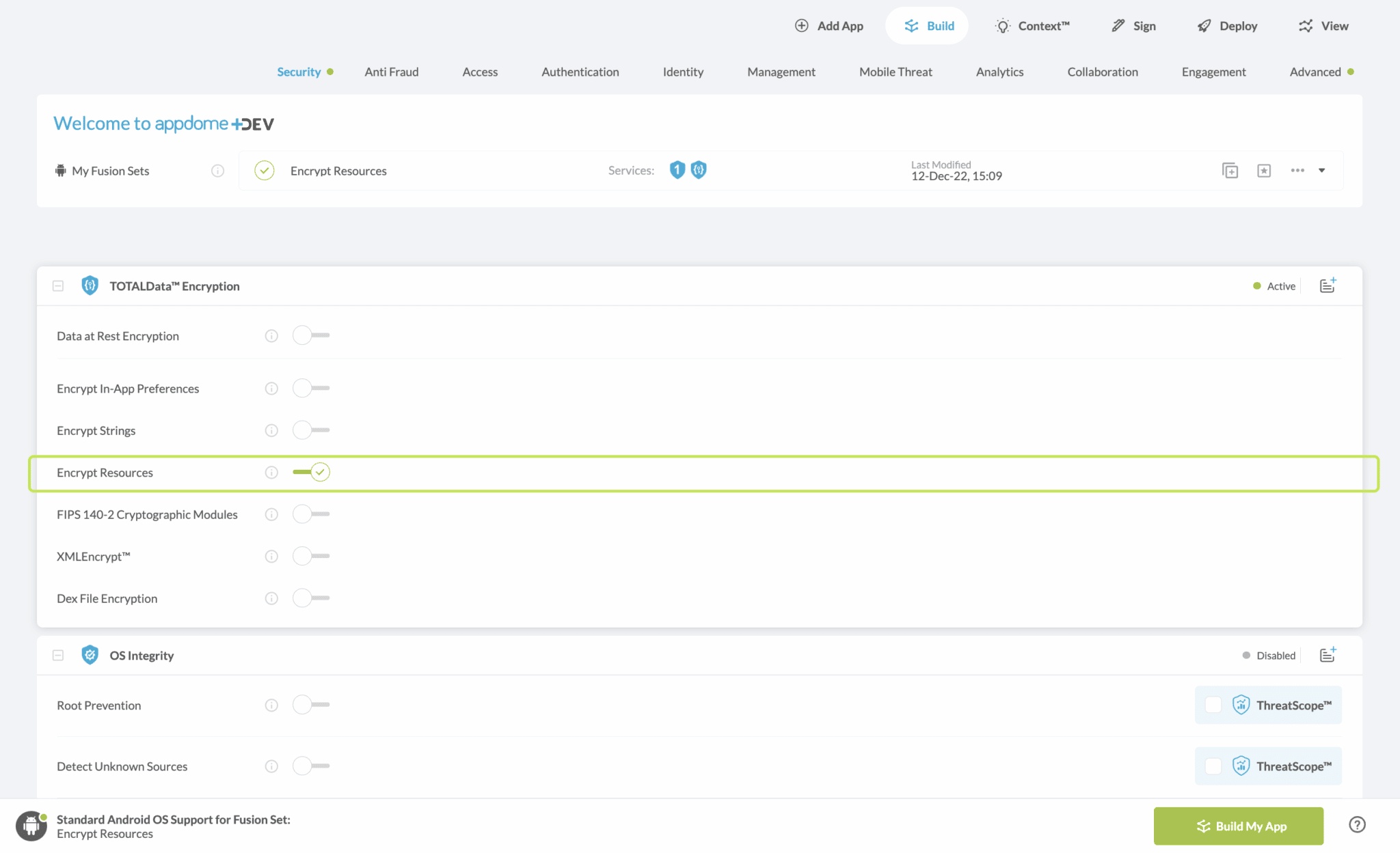 Follow the steps in Sections 2.2-2.2.2 of this article to add the Encrypt Resources feature to your Fusion Set via the Appdome Console.