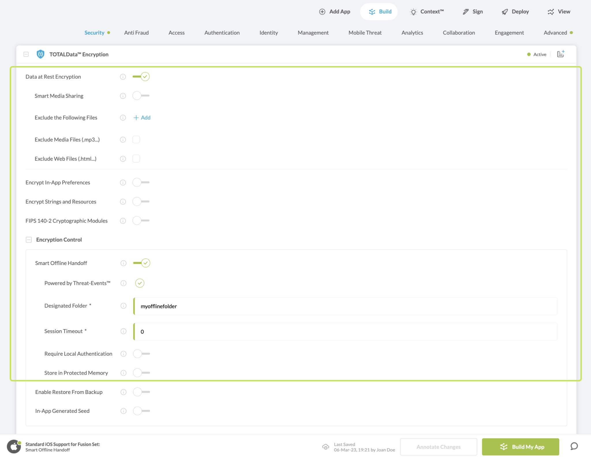 Navigate to Build > Security tab > TOTALData™ Encryption section in the Appdome Console.