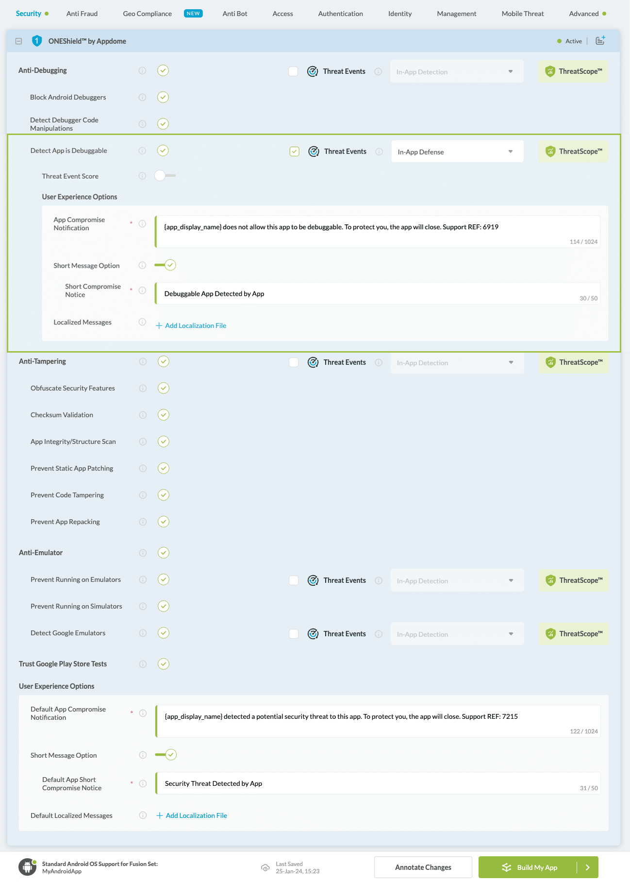 Navigate to Build > Security tab > ONEShield™ section in the Appdome Console.