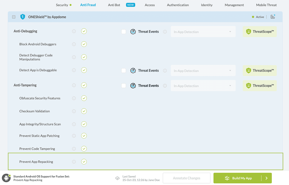 1. Navigate to Build > Security tab > ONEShield™ section in the Appdome Console.