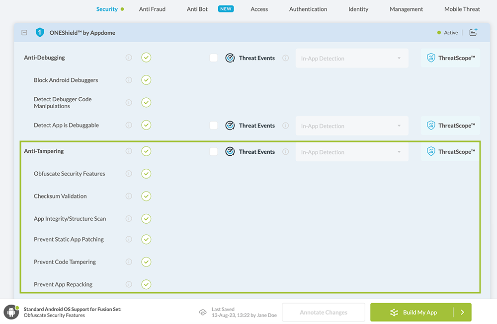 Navigate to Build > Security tab > ONEShield™ section in the Appdome Console.