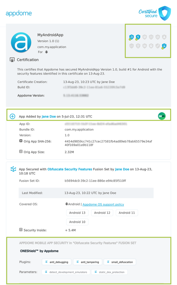 Each Certified Secure™ certificate provides DevOps and DevSecOps organizations the entire workflow summary, audit trail of each build, and proof of protection that Obfuscate Security Features has been added to each Android app. Certified Secure provides instant and in-line DevSecOps compliance certification that Obfuscate Security Features and other mobile app security features are in each build of the mobile app.