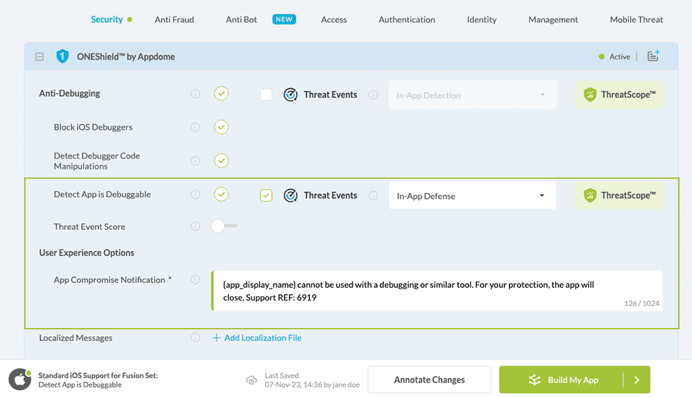 With Threat-Events™ enabled (turned ON), iOS developers can get detailed attack intelligence and granular defense control in iOS applications and create amazing user experiences for all mobile end users when App is Debuggable is detected.