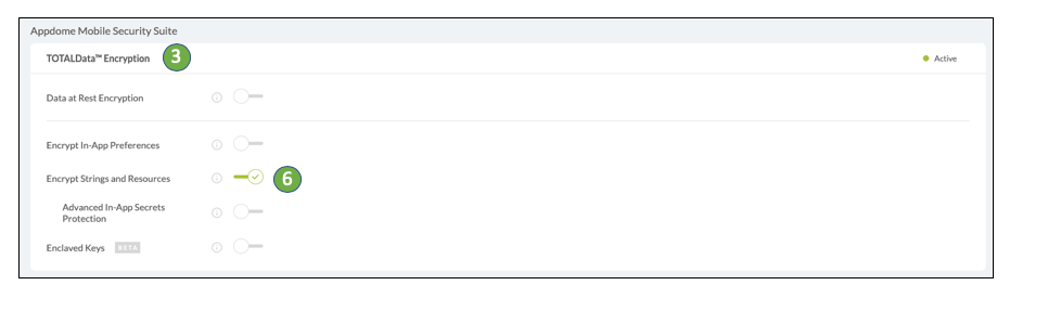 Navigate to Build > Security tab > TOTALData™ Encryption section in the Appdome Console.