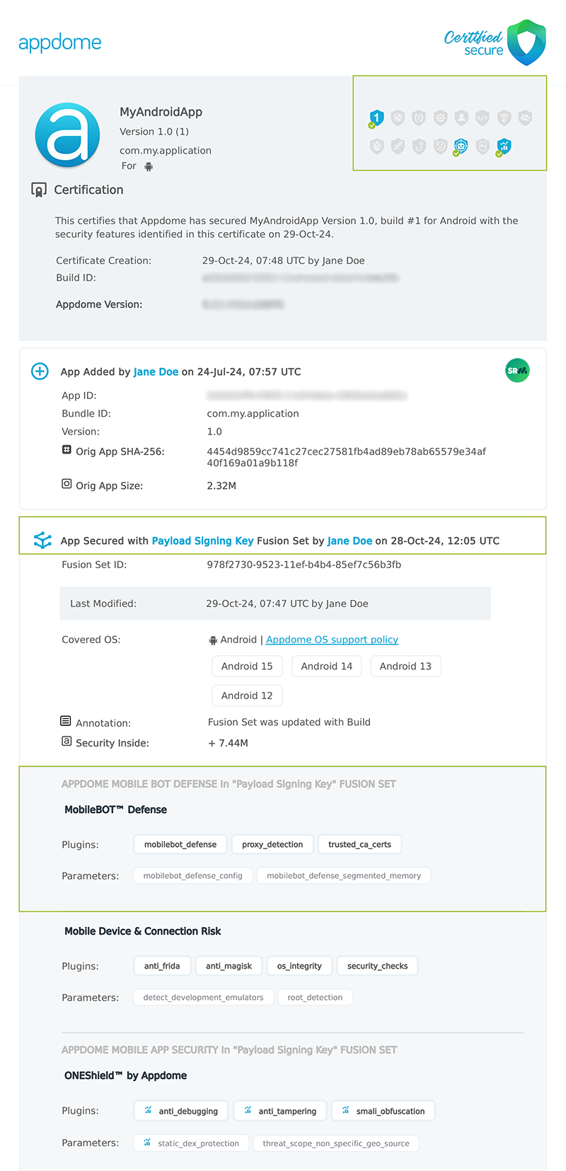 Each Certified Secure™ certificate provides DevOps and DevSecOps organizations the entire workflow summary, audit trail of each build, and proof of protection that Payload Signing Key has been added to each Mobile app. Certified Secure provides instant and in-line DevSecOps compliance certification that Payload Signing Key and other mobile app security features are in each build of the mobile app.