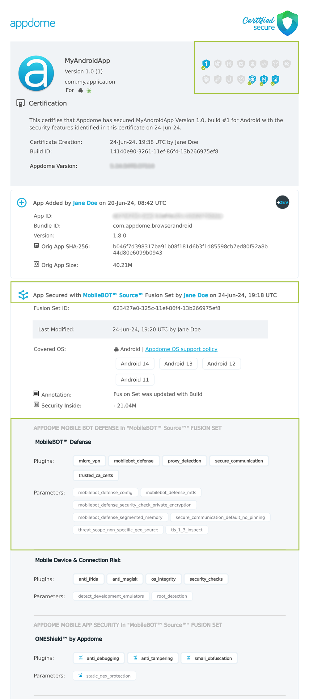 Each Certified Secure™ certificate provides DevOps and DevSecOps organizations the entire workflow summary, audit trail of each build, and proof of protection that MobileBOT Source™ has been added to each Mobile app. Certified Secure provides instant and in-line DevSecOps compliance certification that MobileBOT Source™ and other mobile app security features are in each build of the mobile app.