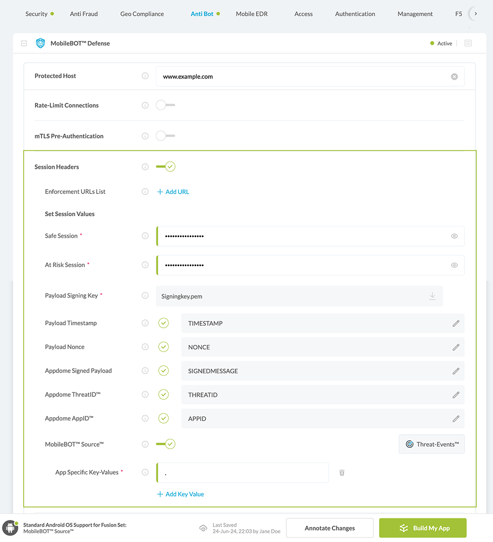 MobileBOT Source™ is a security tool that allows mobile app developers to define a set of App-Specific Key Values to their app’s payload. These key values are then utilized to check the legitimacy of session interactions, ensuring that the interactions are secure and authenticated. Developers can define specific key values that are unique to their application. These values could represent various parameters, such as user ID, session ID, transaction ID, etc., that are critical to the app’s functionality and security.