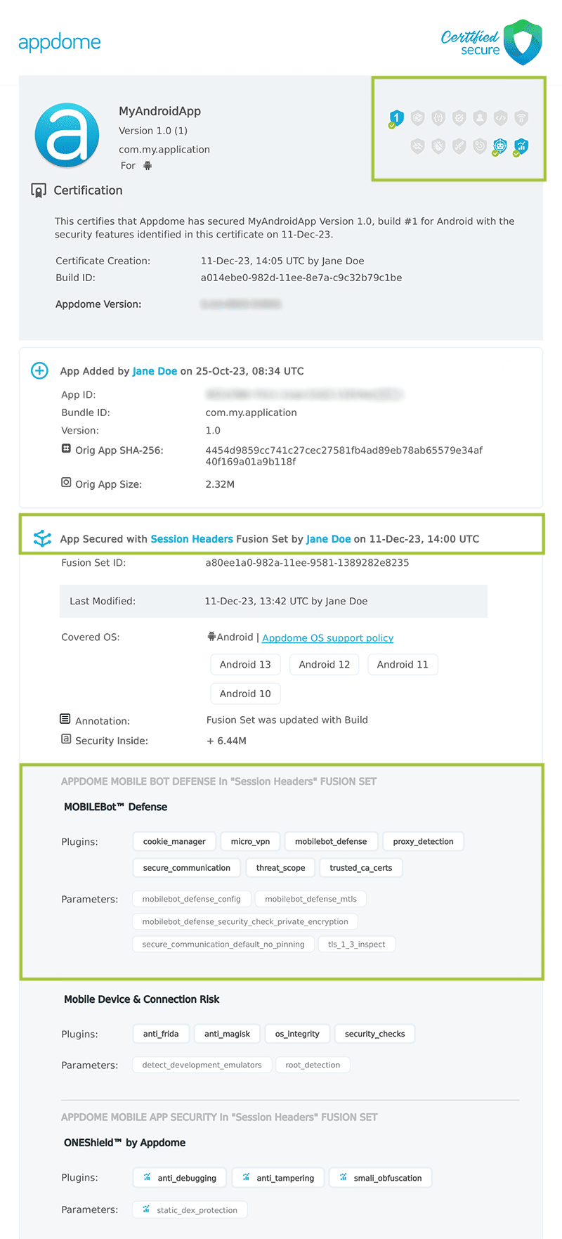 Each Certified Secure™ certificate provides DevOps and DevSecOps organizations the entire workflow summary, audit trail of each build, and proof of protection that Session Risk has been added to each Mobile app. Certified Secure provides instant and in-line DevSecOps compliance certification that Session Risk and other mobile app security features are in each build of the mobile app.