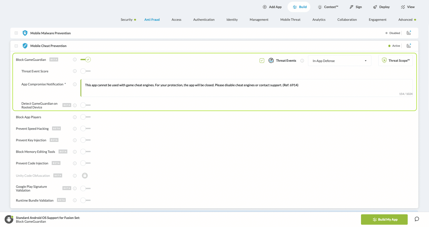 Navigate to Build > Anti Fraud tab > Mobile Cheat Prevention section in the Appdome Console.