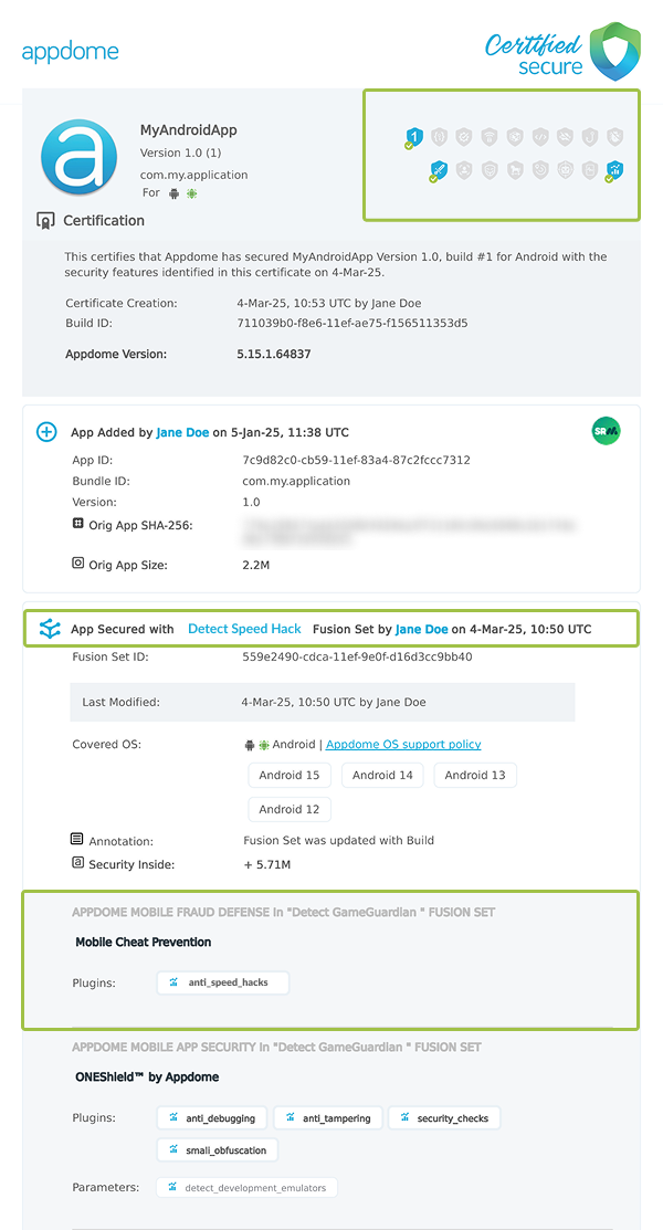 Each Certified Secure™ certificate provides DevOps and DevSecOps organizations the entire workflow summary, audit trail of each build, and proof of protection that Detect Speed Hack has been added to each Android app. Certified Secure provides instant and in-line DevSecOps compliance certification that Detect Speed Hack and other mobile app security features are in each build of the mobile app.