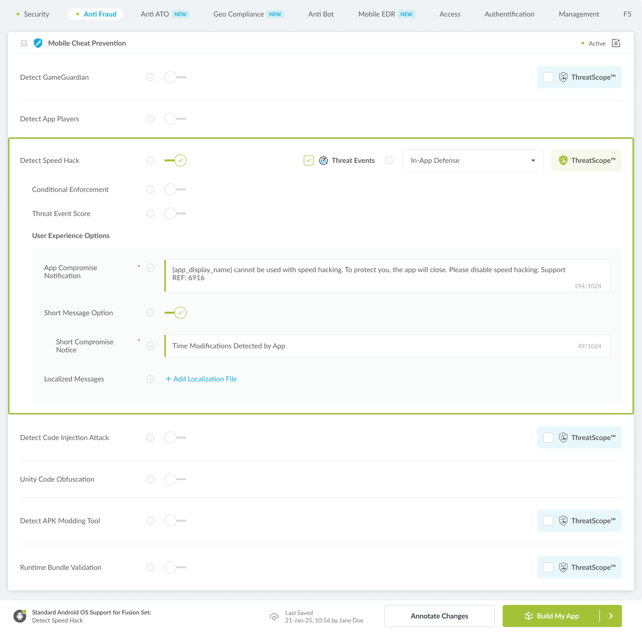 2. Follow the steps in Sections 2.2-2.2.2 of this article to add the Detect Speed Hack feature to your Fusion Set via the Appdome Console.