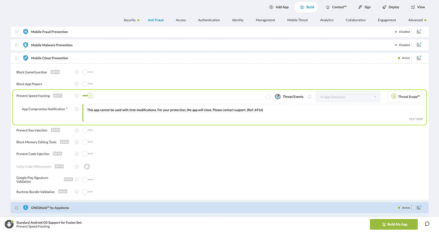 On Appdome, follow these 3 simple steps to create self-defending Android Apps that Detect Speed Hacking without an SDK or gateway: