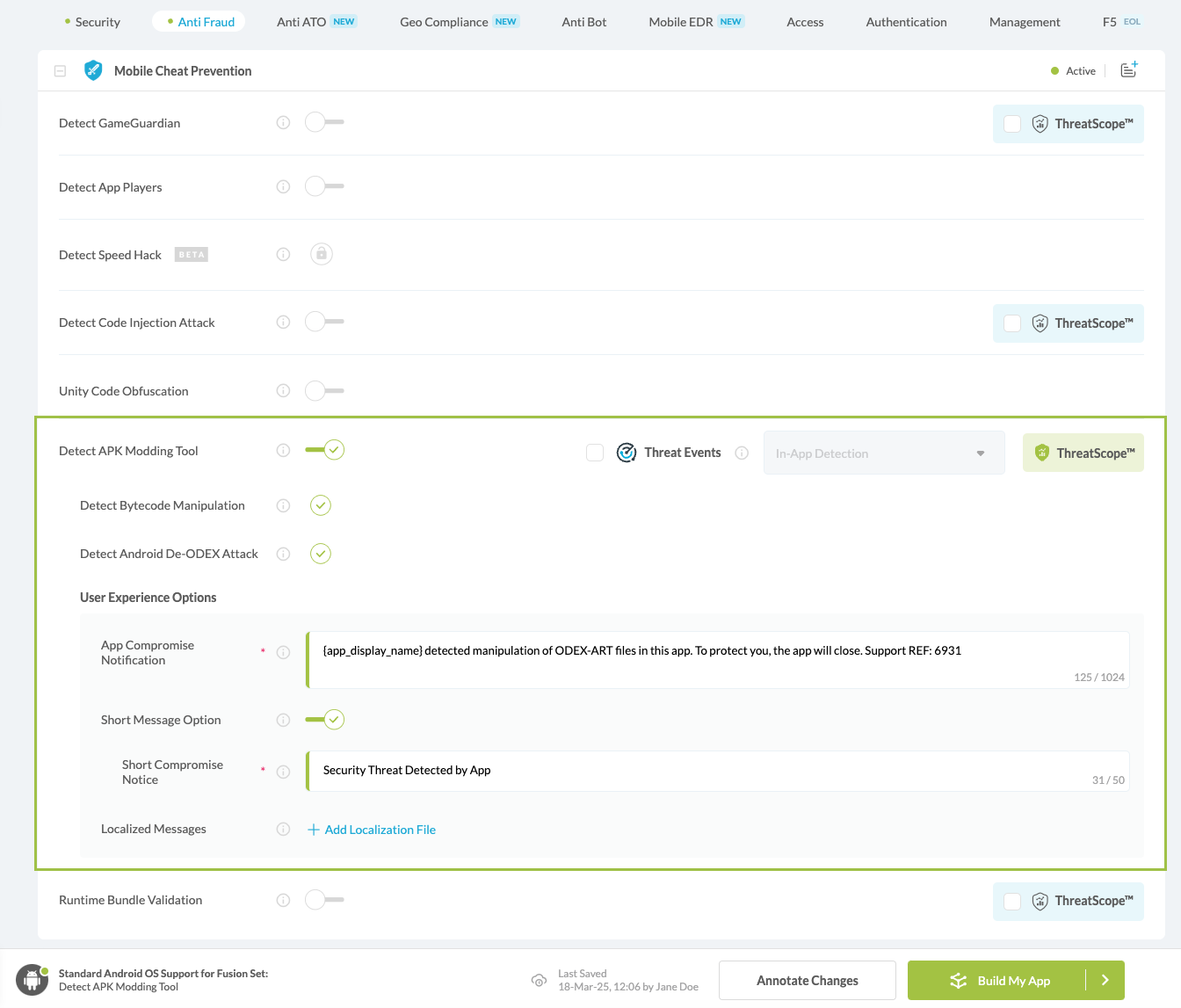 Navigate to Build > Anti Fraud tab > Mobile Cheat Prevention section in the Appdome Console.