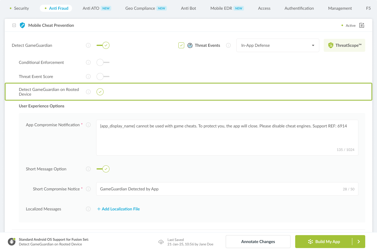 Figure 2: Fusion Set that displays the newly added Detect GameGuardian on Rooted Device protection