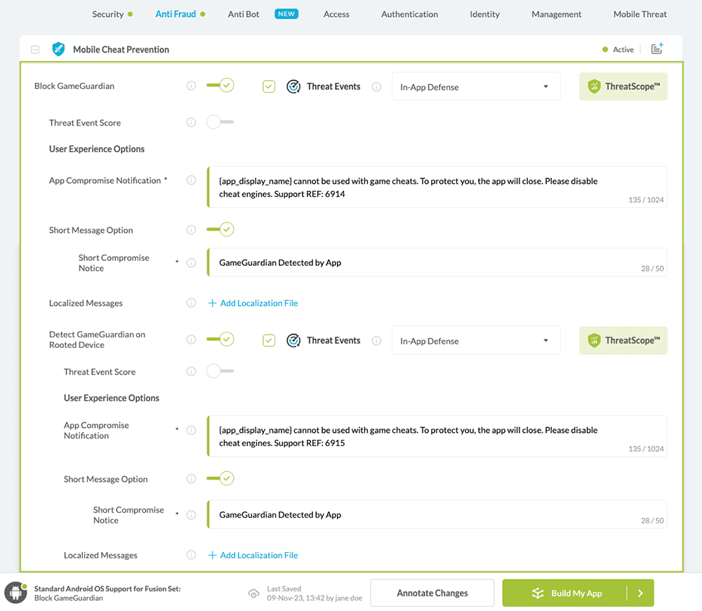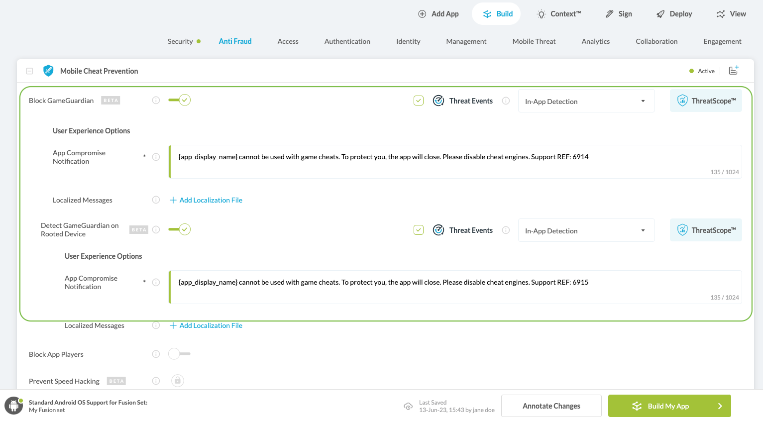 1. Navigate to Build > Anti Fraud tab > Mobile Cheat Prevention section in the Appdome Console.