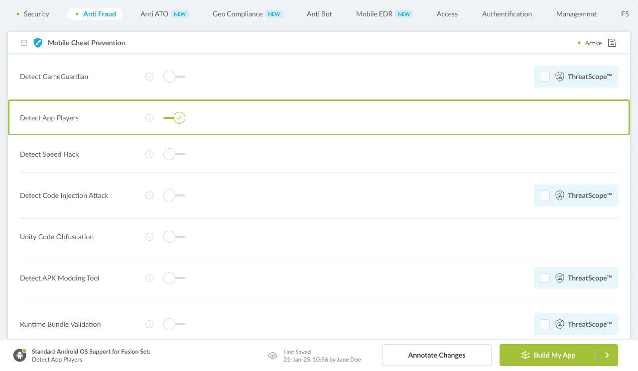 Navigate to Build > Anti Fraud tab > Mobile Cheat Prevention section in the Appdome Console.