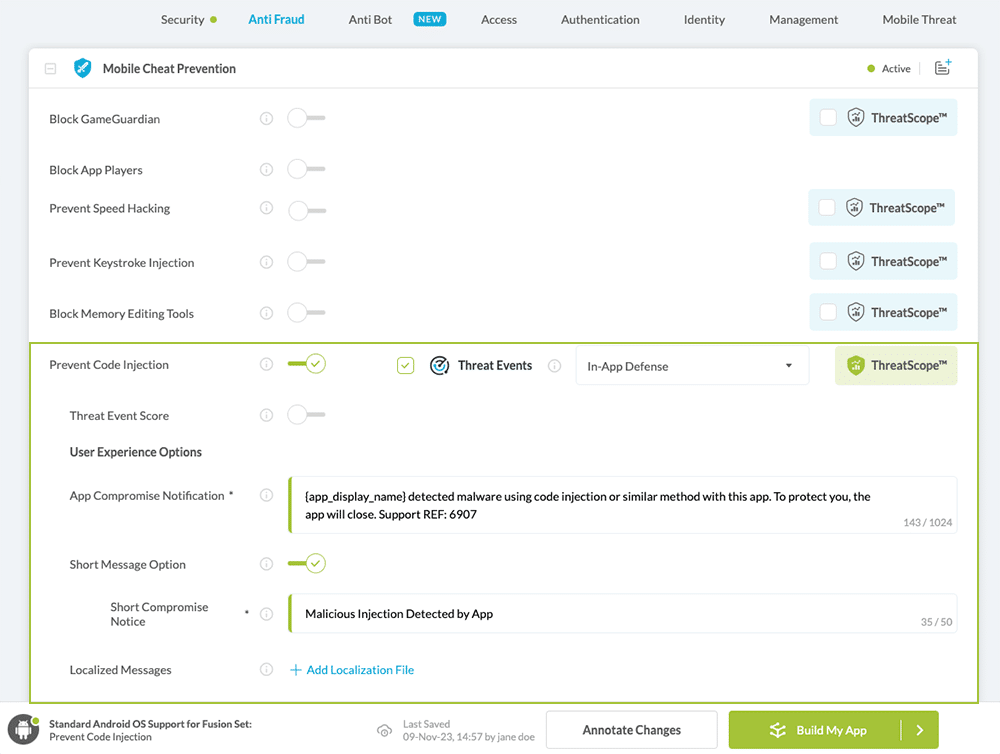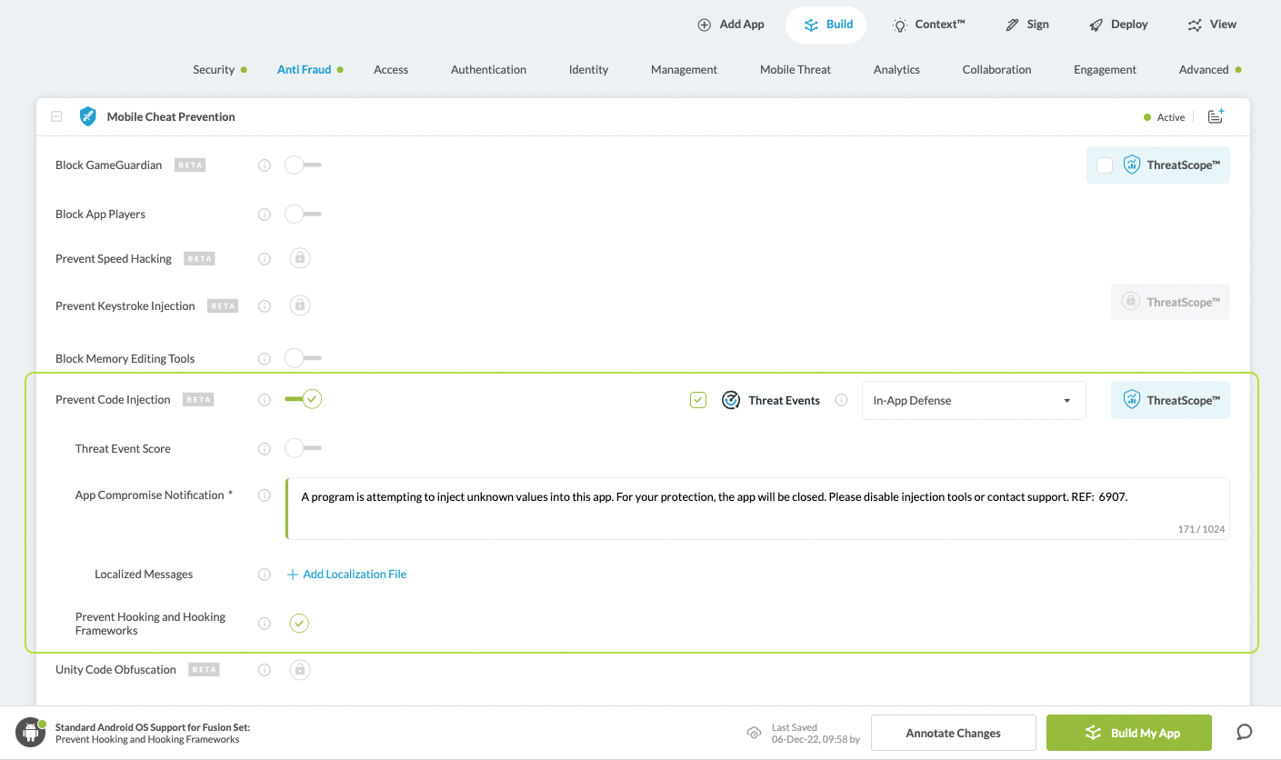 1. Navigate to Build > Anti Fraud tab > Mobile Cheat Prevention section in the Appdome Console.
