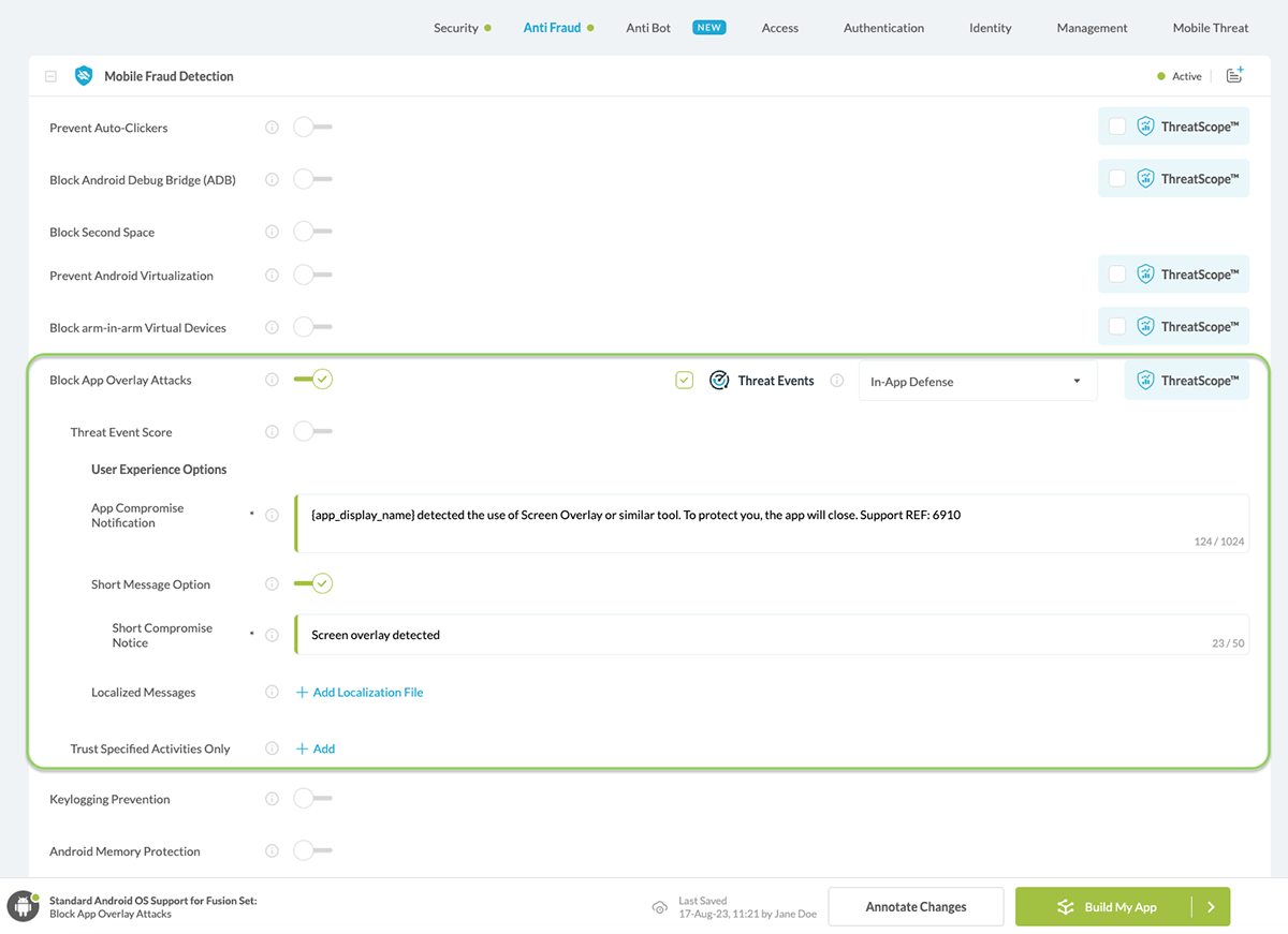 2. Follow the steps in Sections 2.2-2.2.2 of this article to add the Detect Overlay Attacks feature to your Fusion Set via the Appdome Console.